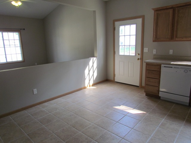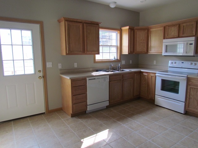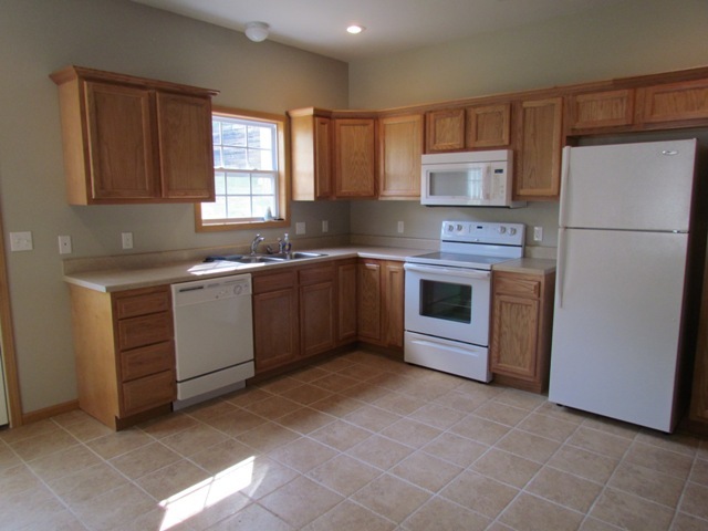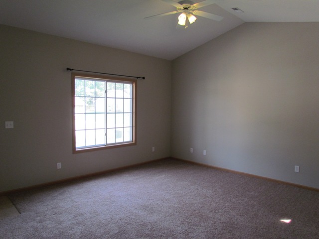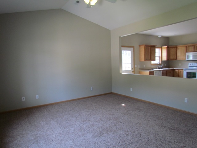 This two bedroom, two bathroom duplex has a single car garage and two extra parking spaces. The living room is carpeted for comfort with a vaulted ceiling and ceiling fan. The kitchen and dining area features ceramic tile floors, white appliances, and oak cabinetry. There is a laundry room with a washer and dryer. The two bedrooms are carpeted for comfort and have large walk-in closets. There is a full guest and master bathroom.