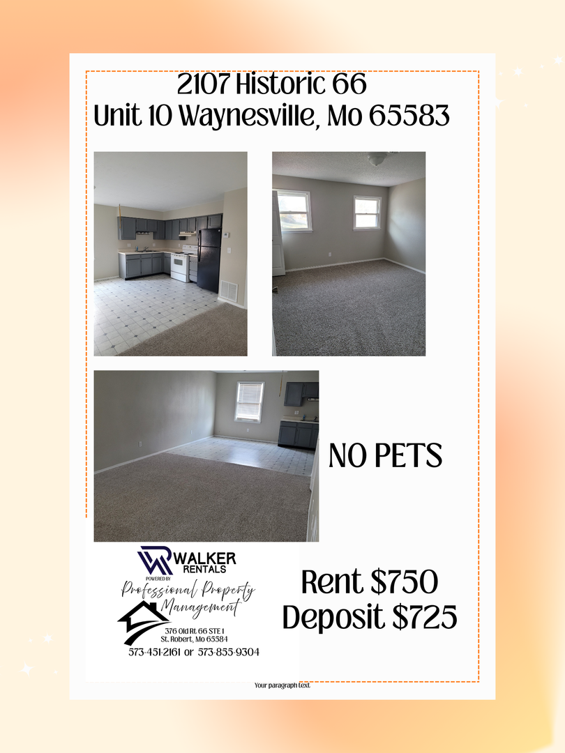 Introducing our cozy 2 bedroom, 1 bathroom apartment located in the heart of Waynesville, MO. This charming unit features a dishwasher, stove, and refrigerator, making meal prep and clean-up a breeze. With a convenient layout and modern appliances, this apartment is perfect for those seeking a comfortable and functional living space. Don't miss out on the opportunity to make this 2 bd 1 bth apartment your new home sweet home. Contact us today for more information on how to make this apartment yours.