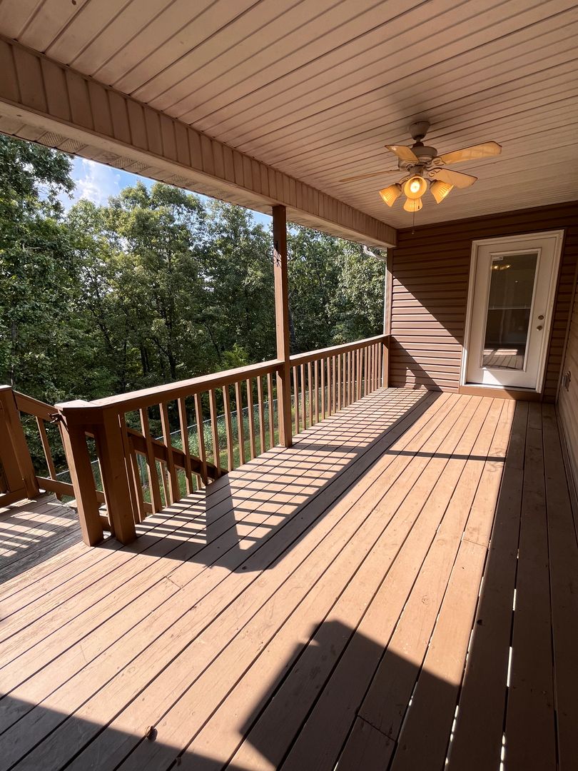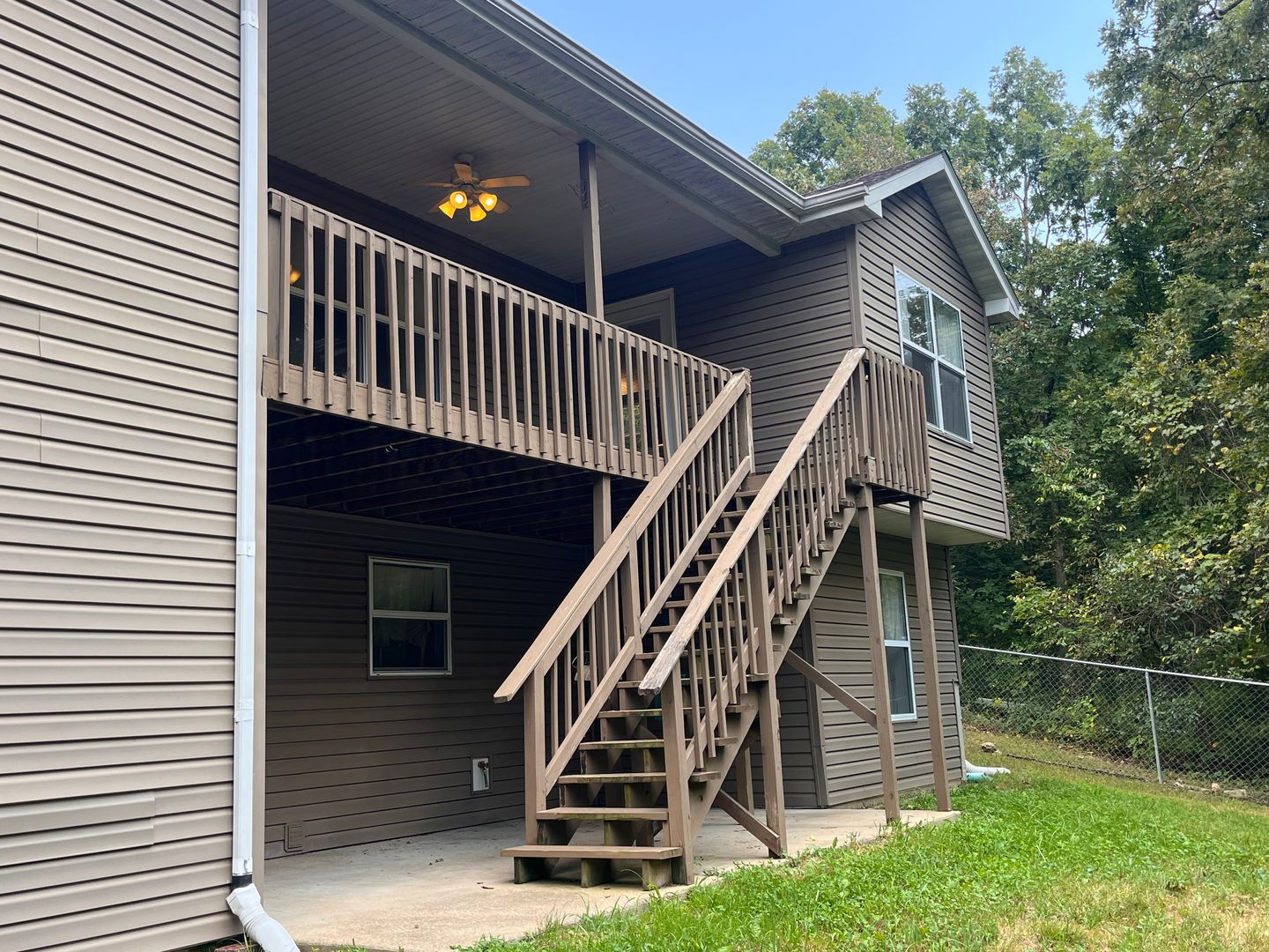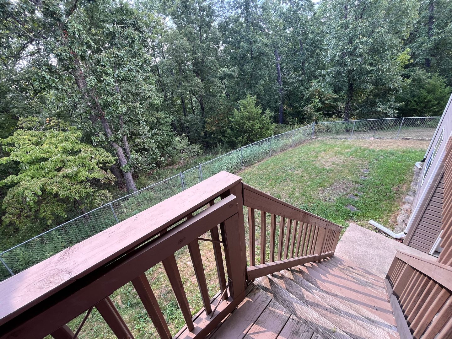 Enter through the front door to find a living room with gorgeous wooded view. To your left, an eat-in kitchen offers breakfast bar, ample cabinetry and access to the covered deck. Back inside, two bedrooms and hall bath are conveniently located on one side of the home, with master suite just across the living room. Enter the master suite to find access to the deck, his and hers closets, a large bathroom with jetted tub and separate shower, along with double bowl vanity. Downstairs, a large family room awaits. A fourth bedroom, third bathroom, laundry room and sizable storage space, sufficient for a home gym round out the lower level. Outside, find a fenced yard with room beyond to run and explore! Located close to FLW, I-44, and Waynesville School District.